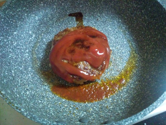 ケチャップ、ソースを入れて酒で伸ばしたのを煮詰めてく