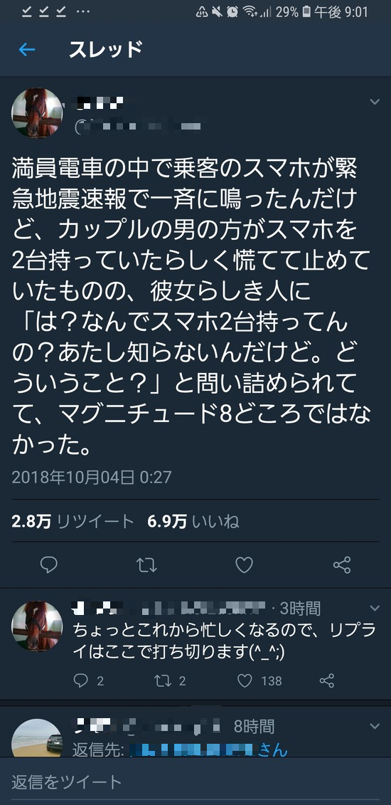 【画像】Twitter女「満員電車で緊急地震速報が鳴ったんだけどカップル…